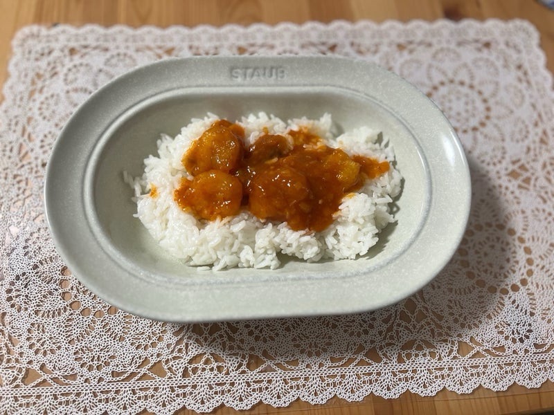 ルクルーゼの鍋、木製のダイニングテーブル、しっかりとした作業台。